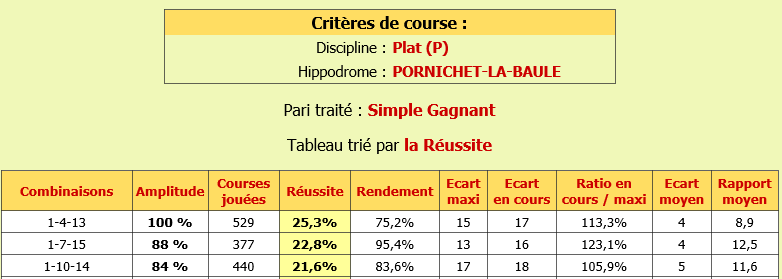 quand on regarde toutes les courses les combinaisons en simple gagnant et placé sortait 10 fois et en regadant plus loin mais ce sera pour plus tard car je suis en phase de test on avait meme 2 couplés Ceci c'était pour une recherche globla de hippodrome de cagnes
